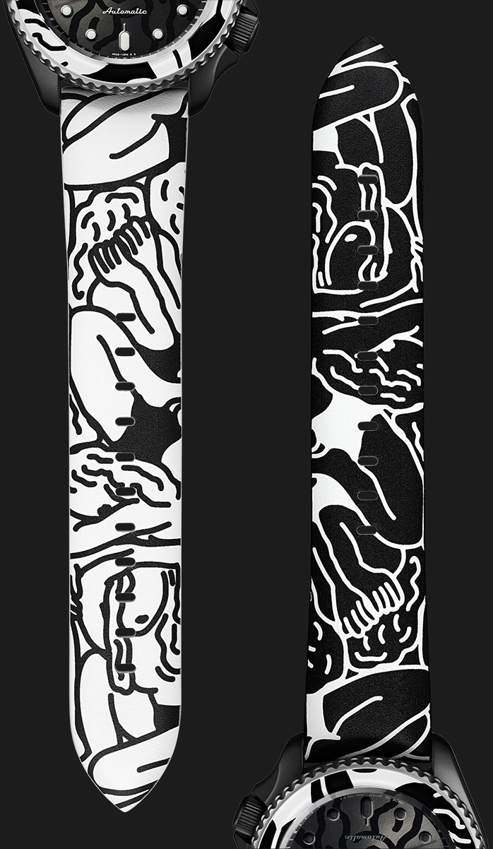 Кожаный ремешок украшен рисунками, специально созданными для лимитированной серии Seiko 5 Sports. Мировоззрение Auto Moai на вашем запястье.